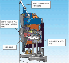 格諾斯公司可根據(jù)加工條件為客戶定制適合的過(guò)濾系統(tǒng),如圖3所示,雙螺桿可直接伸入過(guò)濾器入口內(nèi)部,可以容易地將熔體傳送到濾盤,然后過(guò)濾裝置外組塊出口可與擠出機(jī)模頭連成一體,而不需要法蘭連接(模頭的入口是個(gè)狹縫)。不再需要有相當(dāng)長(zhǎng)度的適配法蘭盤,也不再需要由圓形流道向狹縫流道的轉(zhuǎn)化。