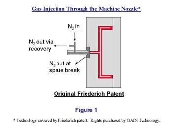 氣體輔助注射成型的實(shí)現(xiàn)方法主要有兩種。這兩種方法的區(qū)別在于氣體注入模腔的位置不同,一種是從噴口注入(見上圖),另一種是直接注入樹脂輸送管或成型件。這兩種方法的重要區(qū)別在于,前者要求所有輸氣管都以噴口為開始端。而采用后者,即直接將氣體注入模具內(nèi)時(shí),只要能確保注入氣體之前樹脂的填充方式恰當(dāng),輸氣管的設(shè)計(jì)不受輸氣口位置的限制。