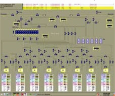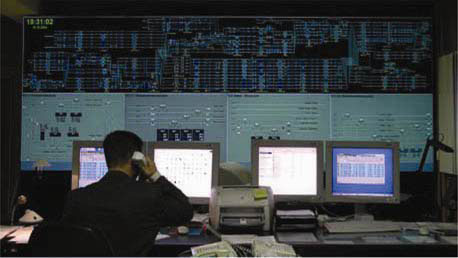 為了提高一個龐大系統(tǒng)內(nèi)可視化方法的使用性,在中央控制室里安裝了集成Wonderware InTouch軟件的視頻墻。該視頻墻的上部分顯示了汽油運輸系統(tǒng)的綜合技術(shù)圖表,而在視頻的下部分顯示其他附加窗口(縮放圖表、事件日志、通信圖表等等),這些窗口可以自動顯示或通過控制人員的命令顯示。
