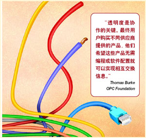 OPC Foundation的主席Thomas Burke先生指出,推動(dòng)各網(wǎng)絡(luò)標(biāo)準(zhǔn)的協(xié)作和互用性一直是他們的目標(biāo)。OPC參與了有關(guān)電子設(shè)備描述語言(EDDL)標(biāo)準(zhǔn)的推廣工作,利用EDDL技術(shù)我們能讓最終用戶對設(shè)備生產(chǎn)商所生產(chǎn)的超過1500萬種設(shè)備和儀表進(jìn)行診斷、配置,并從中獲取實(shí)時(shí)的資產(chǎn)管理信息。OPC還積極推動(dòng)和協(xié)助開發(fā)OPC統(tǒng)一體系架構(gòu)(OPC-UA)標(biāo)準(zhǔn)。