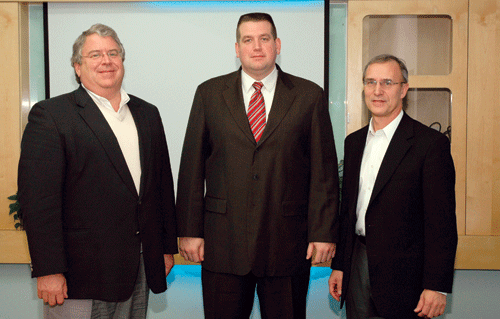 GE Fanuc自動化全球副總裁Stuart W. Scott先生(左)和Christopher 先生(右),以及GE Fanuc自動化大中國區(qū)銷售及渠道運作總監(jiān)石泰武先生(中)