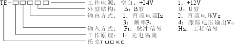 注意:定貨型號(hào)應(yīng)包括:傳感器型號(hào)、輸入/輸出規(guī)格(輸入/輸出范圍值)、精度等級(jí)等。例如:TE- IFr2B-0.05KHz/1~5V-0.5。