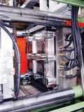 現(xiàn)在所需要的機(jī)器在合理的規(guī)格之內(nèi),但唯一的問(wèn)題是注射量。為了在可接受的周期時(shí)間內(nèi)準(zhǔn)備并射出足夠量的熔體,F(xiàn)oma公司設(shè)計(jì)了一種雙機(jī)筒結(jié)構(gòu)。上位筒儲(chǔ)備所需熔體,然后把它壓入下位桶,最后注入型模內(nèi)。