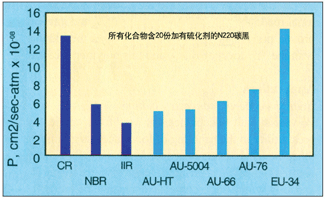 混煉型聚氨酯中,EU-34的滲透性較大,接近CR。由于幾種汽車的使用中對(duì)氮?dú)猸h(huán)境的滲透性能要求較高,因此正在開發(fā)改進(jìn)型的聚氨酯橡膠。
