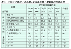 表1、不同分子結(jié)構(gòu)(乙二醇/亞丙基二醇) 聚氨酯的性能比較 |
