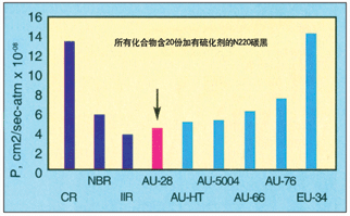 圖2、AU28等混煉型聚氨酯的氮?dú)鉂B透性對(duì)照(80℃,345kPa) |