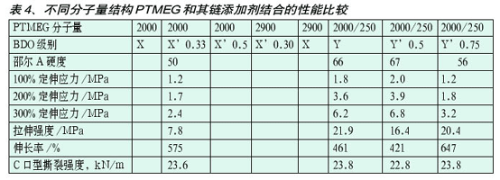 表4、不同分子量結(jié)構(gòu)PTMEG和其鏈添加劑結(jié)合的性能比較 |