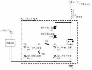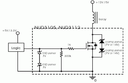 40VN-溝道FET用于轉(zhuǎn)換繼電器線圈中高達(dá)500mA的電流。箝位保護(hù)齊納二極管(14V)提供箝位功能,以抑制在線圈斷開時(shí)(V=Ldi/dt)產(chǎn)生的電壓尖峰。ESD保護(hù)齊納二極管保護(hù)門-源硅結(jié),防止其在器件傳遞或組裝過程中可能由人體感應(yīng)引起的ESD造成損壞。偏置電阻為FET提供驅(qū)動(dòng)控制信號(hào)。圖3描述了NUD3105/NUD3112器件的典型連接圖。