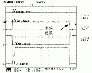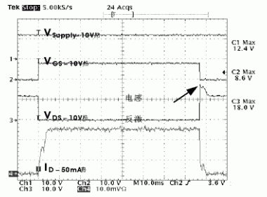 當(dāng)正向邏輯電壓施加到器件的門極時(shí)(5V/3.3V),F(xiàn)ET導(dǎo)通,啟動(dòng)繼電器。當(dāng)FET截止時(shí),繼電器線圈停止,使它反激并產(chǎn)生一個(gè)高電壓尖峰,這個(gè)電壓尖峰被接在FET上的箝位齊納二極管所抑制。這個(gè)工作序列在繼電器驅(qū)動(dòng)器的所有開和關(guān)的操作中重復(fù)。圖4顯示了NUD3112繼電器驅(qū)動(dòng)器控制OMRON繼電器(G8TB-1A-64)時(shí)產(chǎn)生的電壓和電流波形。此繼電器線圈有以下特性:L=46mH,Rdc=100Ω。繼電器從12V電源電壓所吸收的電流是120mA。集成FET典型的導(dǎo)通電阻是1Ω,因此在25℃的環(huán)境溫度時(shí),F(xiàn)ET上產(chǎn)生的功耗大約為15mW(P=I2R)。其結(jié)果是導(dǎo)通壓降只有125mV,電流為120mA。