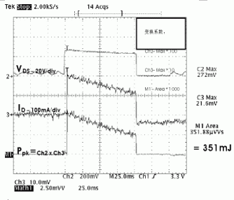 與NUD3105和NUD3112器件(工業(yè)版本)不同,NUD3124器件(汽車版本)的獨(dú)特設(shè)計(jì)提供了有源箝位特性,通過在任何瞬間電壓情況超過箝位齊納二極管擊穿電壓(28V)的時(shí)候觸發(fā)FET,允許更高的反向雪崩能量容量。NUD3124器件的能量容量一般為350mJ。圖8顯示了施加到器件上的浪涌測(cè)試示波器圖,由它可以測(cè)出最大的反向雪崩能量容量。