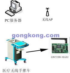 通過1個(gè) GW21SW-MAXI 模塊集成在醫(yī)療無線手推車上,可RS232/RS485/RS422連接醫(yī)療串口設(shè)備,再通過WLAN無線網(wǎng)絡(luò)與與 PC 服務(wù)器連接。WLAN不會(huì)影響心臟起搏器等敏感器件,從而提供即時(shí)信息查詢和臨床數(shù)據(jù)記錄;并且整合了新型無線通訊技術(shù)為醫(yī)療服務(wù)。利用無線局域網(wǎng)橋接技術(shù),可以解決網(wǎng)絡(luò)鋪設(shè)時(shí)遇到不可破壞或不可穿越的公共設(shè)施等問題。