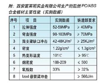 起初采用的熱塑性工程塑料板材有阻燃ABS板、進(jìn)口的阻燃PC板。由于ABS難以阻燃化,采用無鹵阻燃劑不易達(dá)到要求的阻燃等級(jí),而采用氯、溴類阻燃劑雖能達(dá)到要求的阻燃等級(jí),但在燃燒時(shí)會(huì)產(chǎn)生有毒氣體,而苯乙烯的發(fā)煙量也大,即阻燃ABS達(dá)不到低煙密度的要求,很快就被鐵道部禁止了。進(jìn)口的阻燃PC板價(jià)格昂貴,同時(shí),由于PC粘度大,加工性能差(熱塑性工程塑料板材需經(jīng)熱成型后才能裝在列車上),在使用中易產(chǎn)生應(yīng)力開裂,上述三點(diǎn)決定了阻燃PC板也非理想的材料。