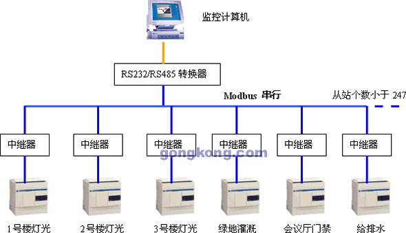 缺點:通信速率慢,監(jiān)控計算機與最遠一個從站距離超過200米時需要加中繼