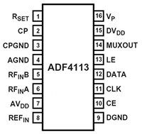 ADF4113是一種直接數(shù)字式頻率合成器,它的最高工作頻率為3.0GHz,工作電壓為2.7~5.5V,可用于無線電基站設(shè)備、無線手提終端和信號檢測設(shè)備等,它的外部引腳如圖2所示。
