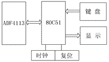 控制部分需要的外圍電路包括時鐘復(fù)位電路、鍵盤顯示電路和與ADF4113的接口電路,控制電路結(jié)構(gòu)如圖3所示。
