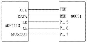 單片機(jī)是通過串口向ADF4113中寫數(shù)據(jù)的,包括時鐘線(DATA)、數(shù)據(jù)線(CLK)和控制信號LE、CE。LE、CE控制信號可由兩個I/O口提供,另外還需單片機(jī)提供一I/O口以檢測鎖定信號。接口電路如圖5所示。