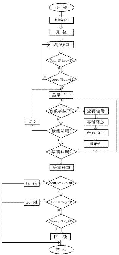 程序執(zhí)行以功能鍵(點頻或掃頻)按下開始,當(dāng)有點頻或掃頻鍵按下時,在最高位的LED顯示“-”以提示輸入數(shù)字,按下數(shù)字鍵“-”消失,開始顯示輸入的數(shù)字。刪除鍵可以刪除已輸入的數(shù)字,回到“-”提示狀態(tài)。按下確認(rèn)鍵進(jìn)入相應(yīng)子程序;按復(fù)位鍵可跳出各子程序,恢復(fù)到初始狀