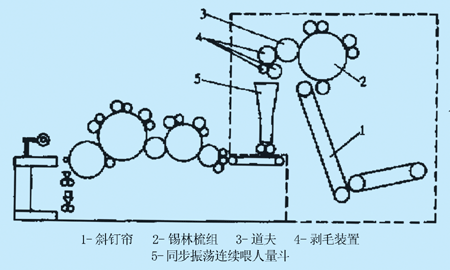 本機(jī)是將兔毛原料未經(jīng)改性處理,直接進(jìn)行開松、梳理,制成一定支數(shù)的毛條,具備抱合力大和加有真捻等特點(diǎn),并由紡紗機(jī)(FNT-28型兔毛紡紗機(jī),專利號(hào):9424N73-4)紡制成各種規(guī)格支數(shù)的細(xì)紗。本機(jī)是國(guó)家發(fā)明專利產(chǎn)品(專利號(hào):93106597-6),"八五"國(guó)家星火項(xiàng)目,同時(shí)又被國(guó)家科委列為"九五"國(guó)家科技成果重點(diǎn)推廣計(jì)劃項(xiàng)目。全機(jī)結(jié)構(gòu)示意圖如圖1所示。