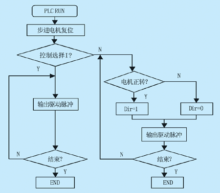 在圖3所示系統(tǒng)中:PLC輸出口Y0、Y1以脈沖速率方式輸入步進(jìn)電機(jī)驅(qū)動(dòng)器的Pulse input端,控制梳理機(jī)主電機(jī)和毛斗電機(jī)轉(zhuǎn)速和位移。PLC輸出口Y2、Y3以方向信號(hào)輸入到驅(qū)動(dòng)器Directional input端,控制梳理機(jī)電機(jī)的轉(zhuǎn)向。輸出點(diǎn)Y4、Y5是步進(jìn)電機(jī)復(fù)位信號(hào)RST,每次開機(jī)對(duì)步進(jìn)電機(jī)驅(qū)動(dòng)器清零。PLC輸入點(diǎn)X0以梳理機(jī)喂入量斗處的紅外傳感器作為輸入信號(hào),可調(diào)節(jié)喂入量斗的喂毛量。X1、X2作為步進(jìn)電機(jī)的啟動(dòng)信號(hào),X3作為步進(jìn)電機(jī)復(fù)位信號(hào)。X4以為位置傳感器作為輸入信號(hào),檢測(cè)梳理機(jī)是否復(fù)位。可以利用當(dāng)需要手動(dòng)操作時(shí),可通過PLC的手動(dòng)輸入信號(hào)X5、X6,以點(diǎn)動(dòng)方式按制電機(jī)的正轉(zhuǎn)或反轉(zhuǎn)??刂脐P(guān)系為:X5=ON,電機(jī)正轉(zhuǎn);X6=ON,電機(jī)反轉(zhuǎn)。