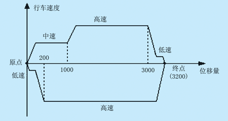 如圖1所示,傳動(dòng)系統(tǒng)從原點(diǎn)啟動(dòng),中速行駛到1000mm,開始高速行駛,高速行駛到3000mm,開始低速爬行,低速爬行到終點(diǎn)(3200mm)停車。停頓2s。反向高速行駛,高速行駛到距原點(diǎn)200mm處開始低速爬行。到達(dá)原點(diǎn)停車,停頓2s后重新開始往返。在原點(diǎn)和終點(diǎn)的低速爬行的目的是為了避免系統(tǒng)慣性帶來的定點(diǎn)誤差,做到原點(diǎn)和終點(diǎn)的精確定位停車。