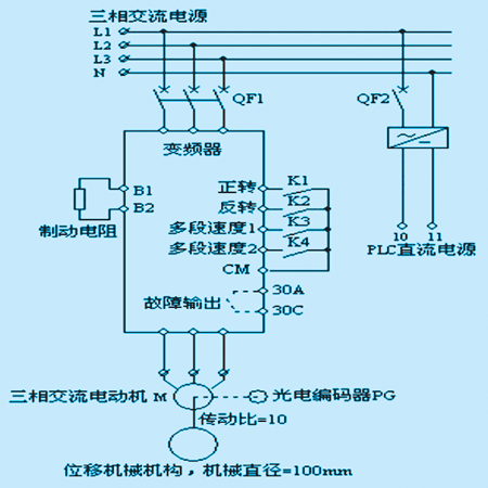 速度的調(diào)節(jié)采用變頻器,定位控制采用光電編碼器和PLC高速計(jì)數(shù)器精確定位。如圖(2)所示變頻器和PLC接線圖。