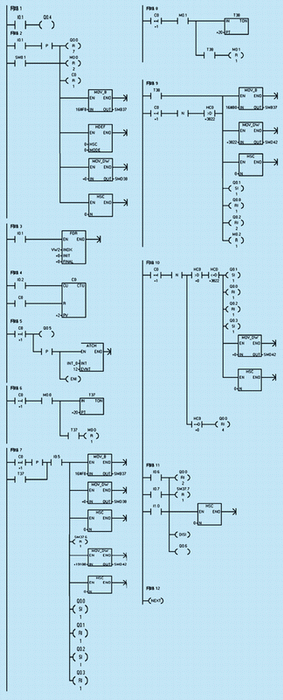 For-Next循環(huán)指令的作用是使輸出線圈能夠重復(fù)使用,簡(jiǎn)化程序。因?yàn)?,兩個(gè)循環(huán)指令的執(zhí)行由旋鈕SF(I0.1)控制,不可能同時(shí)執(zhí)行,循環(huán)體內(nèi)的程序不能同時(shí)掃描刷新。這樣,就可以使輸出線圈重復(fù)使用,沒必要采用中間變量的轉(zhuǎn)換,大大簡(jiǎn)化了程序的編制。