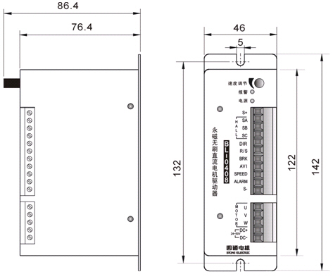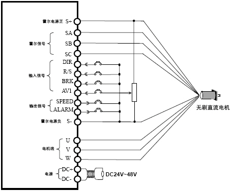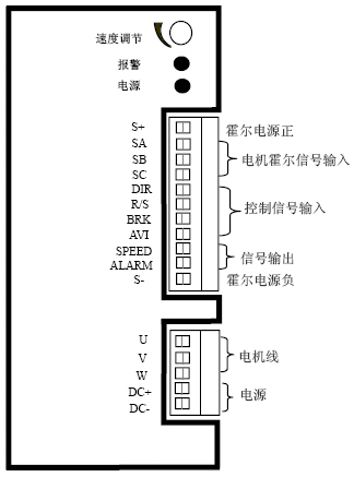 24V~48V直流供電 起停及轉(zhuǎn)向控制 過流、過壓及堵轉(zhuǎn)保護 測速信號輸出 故障報警輸出 外部模擬量調(diào)速 制動快速停機
