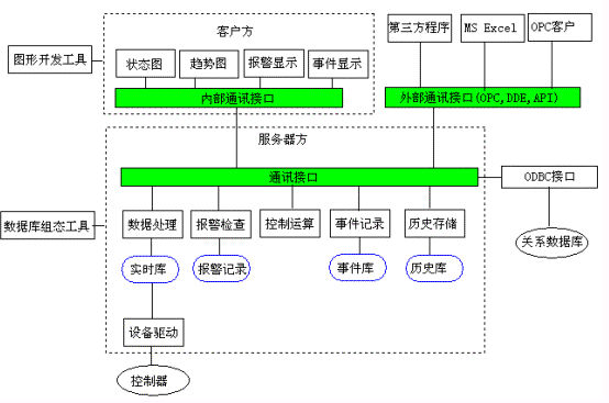 為了效率,服務器上的實時數(shù)據(jù)和歷史數(shù)據(jù)一般都以私有格式存放,實時數(shù)據(jù)駐留在內(nèi)存中,而歷史數(shù)據(jù)保存在磁盤中,事件記錄也可能以私有格式保存在磁盤中,但有些軟件可以將其直接存放到關(guān)系數(shù)據(jù)庫(如Ms SQL Server,ORACLE)中。由于無論采用直接方式還是ODBC與關(guān)系數(shù)據(jù)庫通訊,速度都是比較慢的,所以不可能將快速變化的數(shù)據(jù)都存放到關(guān)系數(shù)據(jù)庫中。那么服務器內(nèi)這些私有格式的數(shù)據(jù)是如何與外界聯(lián)系的呢,下面簡要說明。