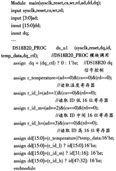 在FPGA中,要實現(xiàn)對DS18B20的通信處理,主模塊要實現(xiàn)對DS18B20_PROC模塊的調(diào)用及建立與CPU之間的接口。