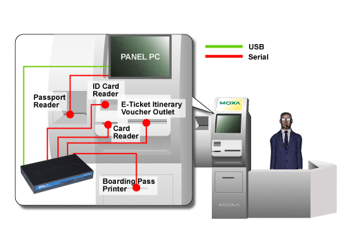 此系統(tǒng)使用一臺IBM小型計算機來控制kiosk,它帶有一個串行端口和二個USB口。問題是系統(tǒng)一共要使用到5 個不同的串行設(shè)備(護(hù)照讀卡器、電子客票打印機、登機牌打印機、身份證讀卡機和俱樂部卡讀卡機)。為了連接這些硬件,他們使用MOXA的UPort 1410,4串口轉(zhuǎn)USB Hub,可以通過一個USB口增加4個串口,同時無需打開電腦機箱。