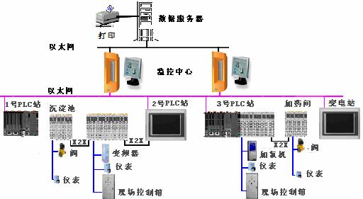 污水處理的工藝流程大體分為:格柵處理、泵房提升、沉砂處理、一次沉淀池、曝氣池處理、二次沉淀池處理、泥漿制備、昭氣利用。需要控制的區(qū)域主要有進(jìn)水泵房,鼓風(fēng)機房,脫水機房,變電所,加藥間等區(qū)域。有柵格、總泵房、沉砂池、生物反應(yīng)池、沉淀池、加氯間、污泥處理裝置、變電站等控制對象。