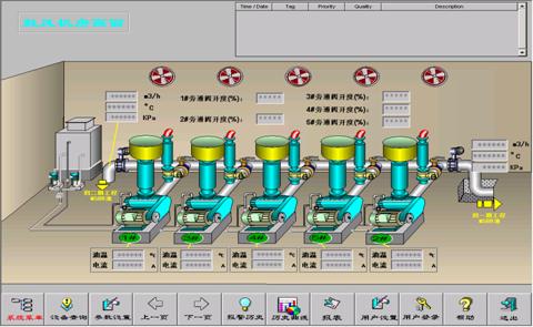 在鼓風(fēng)機房,系統(tǒng)需要控制鼓風(fēng)機組的開關(guān)機順序,檢測鼓風(fēng)機組的故障報警,根據(jù)生化池中溶氧的濃度調(diào)節(jié)出風(fēng)閥開啟度,檢測生化池等相關(guān)儀表的參數(shù)。在脫水機房系統(tǒng)需要采集脫水機房、污泥池內(nèi)電氣設(shè)備運行工況及附近的儀表參數(shù)并對相應(yīng)電氣設(shè)備進(jìn)行控。在變電所需要采集鼓風(fēng)機房高壓變配電所設(shè)備的運行工況及對附近電氣設(shè)備進(jìn)行控制等。具有現(xiàn)場設(shè)備查詢,故障記錄及報警,各項數(shù)據(jù)曲線等功能。