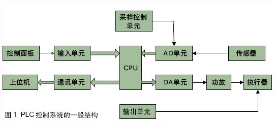 PLC控制系統(tǒng)主要由輸入部分、CPU、采樣部分、輸出控制和通訊部分組成,如圖1所示。輸入部分包括控制面板和輸入模板;采樣部分包括采樣控制模板、AD轉換模板和傳感器;CPU作為系統(tǒng)的核心,完成接收數(shù)據(jù),處理數(shù)據(jù),輸出控制信號;輸出部分有的系統(tǒng)用到DA模板,將輸出信號轉換為模擬量信號,經過功放驅動執(zhí)行器;大多數(shù)系統(tǒng)直接將輸出信號給輸出模板,由輸出模板驅動執(zhí)行器工作;通訊部分由通訊模板和上位機組成。