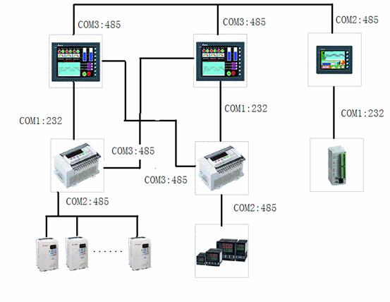 根據(jù)系統(tǒng)變頻器、溫控器通訊要求快速的的要求,采用兩臺(tái)10.4寸人機(jī)分別與兩臺(tái)EH PLC通過(guò)另兩個(gè)通訊口(COM1 COM2)進(jìn)行通訊,那是不是要問(wèn)如上述所說(shuō)不是一機(jī)多屏不是一樣能完成嗎?何必要如此多此一舉呢?那我這里為什么要這么做呢?因?yàn)樵谖覍?shí)際調(diào)試時(shí)發(fā)現(xiàn)用宏程序來(lái)做一機(jī)多屏?xí)r,如果數(shù)據(jù)很多,數(shù)據(jù)利用宏程序在人機(jī)交換,因?yàn)閿?shù)據(jù)很多,人機(jī)的處理速度有限且由于波特率的限制,要滿足非??斓耐ㄓ嵰髸?huì)有一些勉強(qiáng),那么我采用在PLC上加裝DVP-F485卡(只能作為從站),使得一個(gè)PLC能與兩個(gè)觸摸屏通訊,這樣我就可以在與變頻器、溫控器通訊這一塊不用通過(guò)人機(jī)處理直接與兩臺(tái)PLC通訊,這樣通訊慢的問(wèn)題迎刃而解。