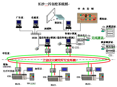 中央控制室設(shè)置兩臺(tái)SCADA工作站(工控機(jī))為操作站。以流行的SCADA軟件作為系統(tǒng)控制軟件,內(nèi)部集成VBA,并配置高清晰投影儀和大型馬賽克模擬屏。廠區(qū)內(nèi)中央控制室和三個(gè)現(xiàn)場(chǎng)控制站組成雙環(huán)光纖冗余以太網(wǎng)絡(luò)系統(tǒng),通訊速率主干線及計(jì)算機(jī)為100Mbps、PLC為10Mbps。中央控制室可調(diào)用各現(xiàn)場(chǎng)站的全部運(yùn)行信息,在中央控制室可控制現(xiàn)場(chǎng)主要設(shè)備的啟動(dòng)和停止。