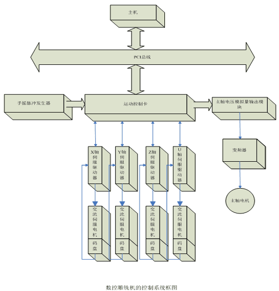 以PC機(jī)作為信息處理平臺(tái),運(yùn)動(dòng)控制卡以插卡形式嵌入PC機(jī),即“PC十運(yùn)動(dòng)控制卡”的模式。下圖1中所示為四軸數(shù)控雕銑機(jī)的控制系統(tǒng)結(jié)構(gòu)框圖。