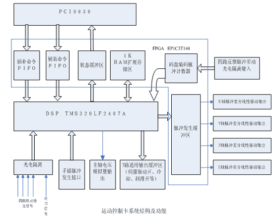 本文基于計(jì)算機(jī)的PCI總線,設(shè)計(jì)出一種以DSP+FPGA為核心控制芯片的高速度、高精度、高效率、高可靠性的數(shù)控雕銑機(jī)運(yùn)動(dòng)控制系統(tǒng)。該系統(tǒng)提供4軸閉環(huán)伺服控制,8路高速光電隔離編碼脈沖反饋,5路普通光電隔離通用信號(hào)輸入,7路通用信號(hào)輸出,1路主軸電機(jī)模擬量電壓輸出。