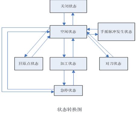 DSP軟件中定義了若干不同的雕刻機(jī)工作狀態(tài):關(guān)閉狀態(tài)、空閑狀態(tài)、手搖脈沖發(fā)生器狀態(tài)、回機(jī)械原點(diǎn)狀態(tài)、對(duì)刀狀態(tài)、加工狀態(tài)、緊急停止?fàn)顟B(tài)。關(guān)閉狀態(tài)下,運(yùn)動(dòng)控制卡將忽略一切命令,只接受控制卡打開命令。打開控制卡后,DSP將打開四個(gè)進(jìn)給軸的伺服驅(qū)動(dòng)器,并轉(zhuǎn)入空閑狀態(tài)??臻e狀態(tài)下,雕刻機(jī)可執(zhí)行一切控制命令。當(dāng)進(jìn)入到手搖脈沖發(fā)生器狀態(tài)時(shí)為了避免和G代碼等加工指令沖突,將禁止執(zhí)行插補(bǔ)計(jì)算和加工命令。退出手搖脈沖發(fā)生狀態(tài)并轉(zhuǎn)入空閑狀態(tài)后才可以執(zhí)行加工命令。