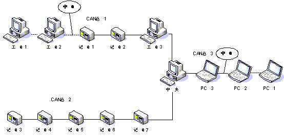 某炭素公司的主導(dǎo)產(chǎn)品為高功率圓柱型電極,主要生產(chǎn)流程包括中碎配料、糊料生產(chǎn)、擠壓成型、電極石墨化、高壓浸漬、環(huán)式爐或倒焰爐煅燒和成品機(jī)加等七道工序,另外還有一個煤氣站用于給整個生產(chǎn)流程提供加熱控制用熱源。這些流程都有一臺工控機(jī)或配備了具有RS485通訊接口和通訊功能的無紙記錄儀。公司為了提高管理水平,確保電極質(zhì)量,建立了一個基于CAN總線的全廠工藝參數(shù)自動監(jiān)控系統(tǒng)。該系統(tǒng)以各流程處工控機(jī)和無紙記錄儀為終端站,采集各流程的實時工藝參數(shù),執(zhí)行相應(yīng)工藝過程控制;由中央監(jiān)控機(jī)收集、存貯和集中顯示各站點(diǎn)數(shù)據(jù),建立全廠工藝參數(shù)數(shù)據(jù)庫,完成工藝過程質(zhì)量分析、統(tǒng)計、報表、打印等監(jiān)測功能。同時,為了便于管理人員實時了解與掌握全廠生產(chǎn)和工藝變化情況,在主要管理員辦公室配置了相應(yīng)PC機(jī)終端,這類終端與中央監(jiān)控機(jī)通訊,可實時顯示各站點(diǎn)數(shù)據(jù)。網(wǎng)絡(luò)系統(tǒng)組成示意如圖1,各工控機(jī)和PC機(jī)通過CAN卡上網(wǎng),無紙記錄儀通過485/CAN智能轉(zhuǎn)換卡上網(wǎng)。中央機(jī)和各站點(diǎn)工控機(jī)、PC機(jī)采用MCGS組態(tài)軟件作為開發(fā)平臺,開發(fā)相應(yīng)的用戶程序,通過OPC服務(wù)器軟件實現(xiàn)CAN總線數(shù)據(jù)傳輸通訊。根據(jù)設(shè)備分布情況,該系統(tǒng)由三條CAN總線構(gòu)成。