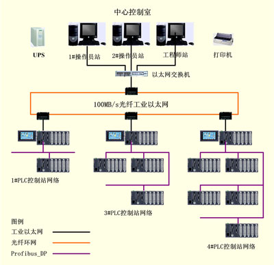 該水廠自控系統(tǒng)主網(wǎng)絡(luò)采用了光纖環(huán)網(wǎng)。中央控制室、加氯加藥控制站(1#PLC)、濾池控制站(3#PLC)、出水泵房控制站(4#PLC)組成了環(huán)形的光纖網(wǎng)絡(luò),這樣保證了一旦在環(huán)形網(wǎng)絡(luò)的任意點(diǎn)意外斷開(kāi)的情況下,不會(huì)影響系統(tǒng)通訊功能,同時(shí)又實(shí)現(xiàn)了對(duì)電氣信號(hào)的隔離,避免了雷電信號(hào)、浪涌信號(hào)在網(wǎng)絡(luò)間的傳輸。