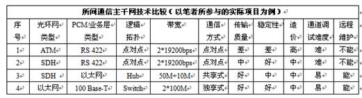 從上表中可以看出:方案1或方案2使用通信系統(tǒng)提供的串口,方案3采用的是IP over SDH,方案4是真正的城域以太網(wǎng)技術(shù),通信系統(tǒng)僅提供傳輸介質(zhì)。
