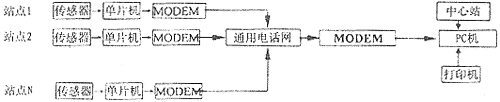本系統(tǒng)采用了MODEM將前端單片機采集的數(shù)據(jù)通過電話網(wǎng)遠程傳輸?shù)街行恼綪C機,并實現(xiàn)一對多點通信(站點數(shù)、通信距離均不限),后臺PC機通過撥號的方式對各站點進行數(shù)據(jù)接收并實時存儲記錄、查詢、打印。系統(tǒng)框圖如圖1所示。