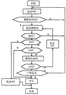 當某一方單片機接收到呼叫振鈴后,RI信號有效,8250的INTRPT引腳高電平中斷,系統(tǒng)便進入數(shù)據(jù)通信狀態(tài),為了使數(shù)據(jù)傳送準確無誤,編程采用XMODEM協(xié)議對數(shù)據(jù)打包處理,單片機數(shù)據(jù)通信程序流程圖如圖4。