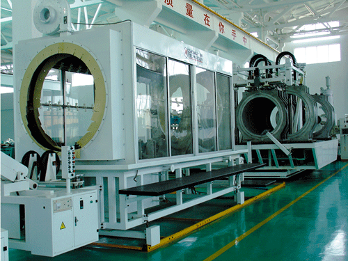 SBG-1500型大口徑雙壁波紋管生產(chǎn)線是中云公司自行研制的塑料機械,可生產(chǎn)外徑達1500mm的大口徑雙壁波紋管材,所產(chǎn)管材廣泛應(yīng)用于排水、排污、通風(fēng)系統(tǒng)。生產(chǎn)線波紋成型模具使用高強度鋁合金材料,采用壓力鑄造成型工藝,具有強度大、精度高、表面光潔的優(yōu)點;波型設(shè)計先進合理,能有效的提高波紋管環(huán)剛度,并節(jié)省用料;采用PCC控制系統(tǒng),提高了全線自動化程度,并具有遠程故障診斷和遠程通訊功能;冷卻定徑芯棒采用了鋁合金材質(zhì),有效地提高了冷卻效果,在國內(nèi)尚屬首創(chuàng)。該機組經(jīng)山東省機械工業(yè)濰坊產(chǎn)品質(zhì)量檢測站檢測,所測項目性能指標(biāo)均達到Q/YZY001-2003企業(yè)標(biāo)準(zhǔn)。用該機組生產(chǎn)的雙壁波紋管經(jīng)國家化學(xué)建筑材料測試中心檢測,所測指標(biāo)符合歐洲PrEN13476-1標(biāo)準(zhǔn)。