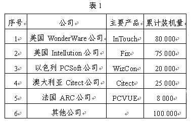 作為工業(yè)自動(dòng)化控制設(shè)備監(jiān)視、控制、管理的工具和企業(yè)信息管理系統(tǒng)的重要組成部分,實(shí)時(shí)監(jiān)控軟件平臺(tái)在工業(yè)生產(chǎn)中越來越多地得到應(yīng)用。表1是國(guó)外主要商品化實(shí)時(shí)監(jiān)控軟件平臺(tái)的市場(chǎng)銷售情況一覽表。