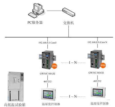 通過(guò)GW51C-MAXI 可串口連接低溫試驗(yàn)箱,再通過(guò)網(wǎng)絡(luò)與遠(yuǎn)端PC服務(wù)器連接,可虛擬為PC機(jī)的串口端口,使PC機(jī)可同時(shí)連接多臺(tái)試驗(yàn)箱,延長(zhǎng)了串口數(shù)據(jù)傳輸距離,減少PC機(jī)的使用數(shù)量降低了使用成本。