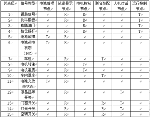 本方案中,電動(dòng)汽車(chē)每個(gè)電控單元的接收和發(fā)送的數(shù)據(jù)類(lèi)型如表(1)所示,其中T表示發(fā)送,R表示接收。