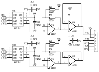 圖7為模擬量輸出電路,DAC7513是低功耗、單信道、12位緩沖電壓輸出D/A轉(zhuǎn)換器(DAC)。芯片內(nèi)含精密輸出放大器,使(rail-to-rail)軌對(duì)軌輸出成為可能。它采用通用三線串行接口,操作時(shí)鐘頻率高達(dá)30MHz,與標(biāo)準(zhǔn)接口兼容。DAC7513集成了上電復(fù)位電路,上電時(shí)輸出電壓為0V并保留此狀態(tài)直到產(chǎn)生對(duì)器件有效的寫(xiě),包含掉電特性,在結(jié)束串口訪問(wèn)后,電流消耗可降為200nA(5V)。DAC7513的功耗為0.5mW(5V),掉電模式均降為1μW。