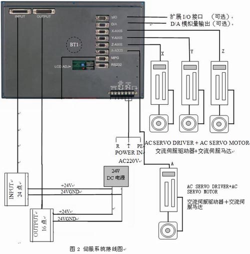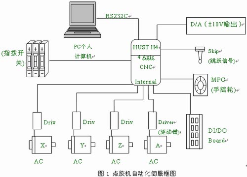 點膠機設(shè)備需要四個軸控制即X、Y(2個)、Z,但是X和Y(2個)要進行插補運行,而插補運行時在G代碼的加工軟件指令中只有X和Y、X和Z、Y和Z,要與CAD等圖形編輯軟件生成的G代碼程序通用就不能使用2個Y軸;因此我們解決的方式是使用中達電通的四軸數(shù)控系統(tǒng)(PUTNC-H4-4):X軸控制原來的X軸在橫向運動;Y軸控制原來的Y1軸,同橫向的X軸進行插補控制第一個點膠平臺;Z軸控制原來的Y2軸,同橫向的X軸進行插補控制第二個點膠平臺;A軸控制原來的Z軸走不同高度的點膠面;這樣就可以解決控制系統(tǒng)能直接執(zhí)行CAD等圖形編輯軟件生成的代碼程序;中達的數(shù)控系統(tǒng)本身具有24個輸入點、16個輸出點,設(shè)備的I/O點也夠使用;中達的A系列伺服使用的控制理論是最先進的強健式的控制理論(PDFF),即使在伺服電機的負載慣量大范圍的變化時,伺服系統(tǒng)仍然可以保持優(yōu)異的性能,進行流暢、精準、正確地定位。通過客戶的技術(shù)要求和原控制方案的不足我們選擇了基于中達電通的數(shù)控系統(tǒng)的控制方案,系統(tǒng)由數(shù)控系統(tǒng)、伺服控制系統(tǒng)、執(zhí)行機構(gòu)組成控制方案,參見圖1。系統(tǒng)電氣接線參見圖2。電控柜圖片參見圖3。