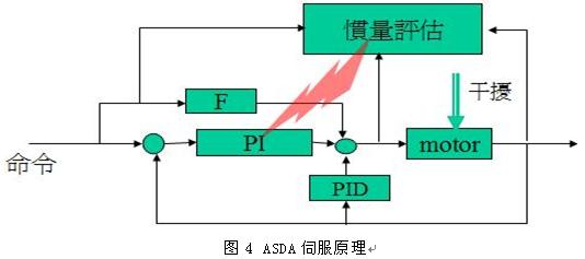 中達ASD-A0121LA型配置3套;ASD-A0221LA型配置1套。ASDA伺服原理采用的是先進強健式的控制理論(PDFF),如圖4所示。